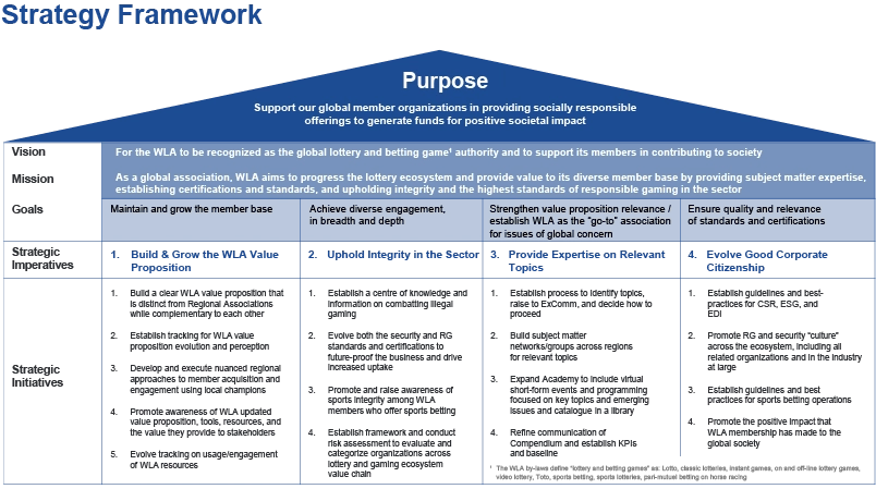 We will promote a responsible gaming and security “culture” across the lotteries and sports betting ecosystem, comprising all related organizations and industry at large, as well as underscoring the positive impact that WLA membership has had on global societies. Â